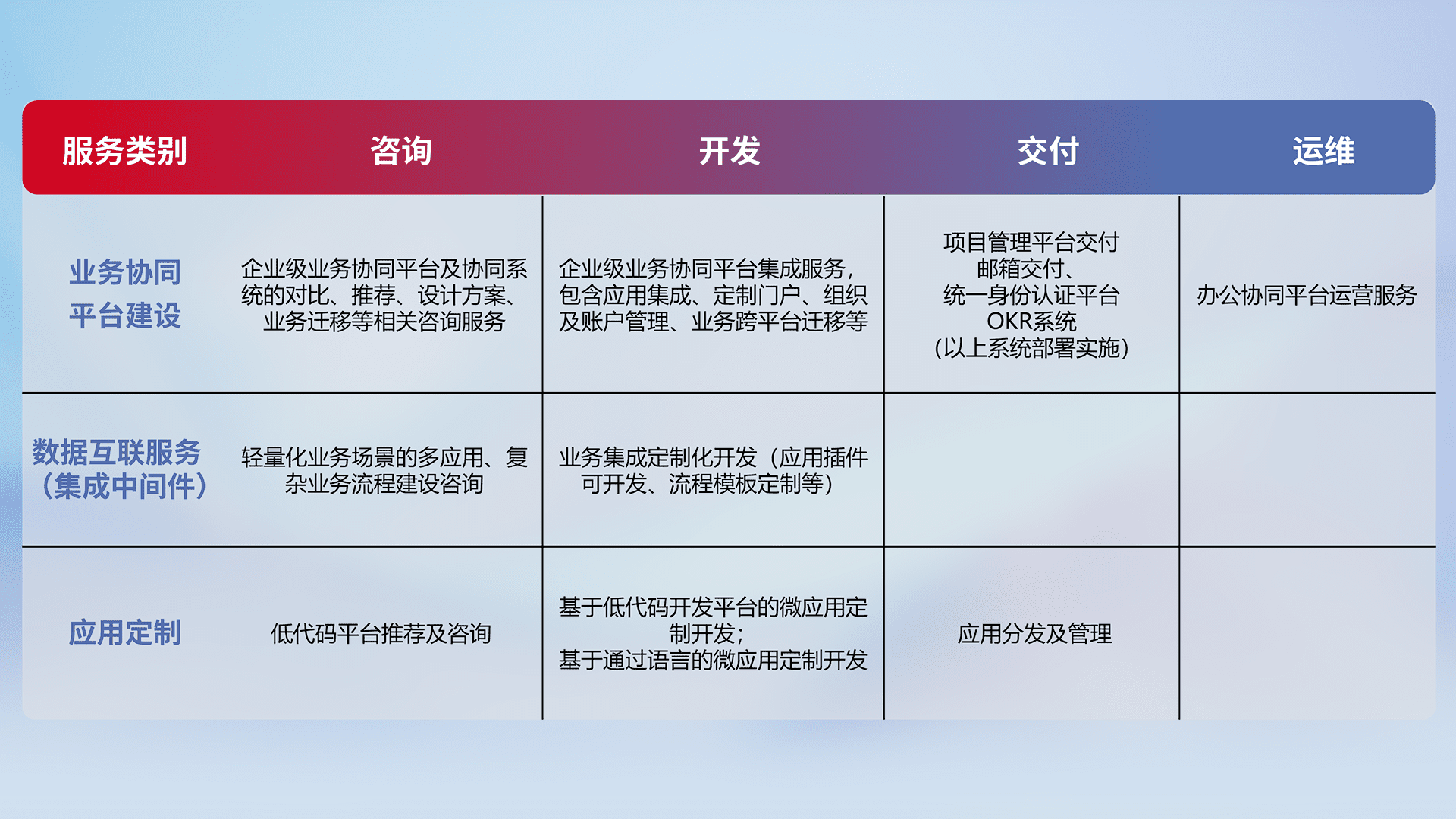 针对钉钉、、、、企微、、IDaas等平台级产品提供产品的规划、、、、方案、、、交付、、定制化开发等服务,,,,实现如统一协同办公、、、智能客户服务、、混合会议管理、、、智能数据查询、、、等业务场景,,实现数字化转型。。。